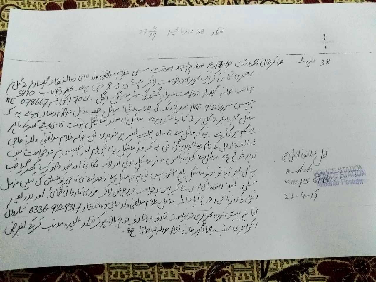 APP | dawood butt | asalam-o-alaikum Sir..! arz yeh thi k meri bike 2019 ramzan ul mubarikh se pehle ghar k aagay se lock chori hui thi jo k ab ja kr yakatoot ma bramat hui taqreebn 3 se 4 week pehle itala aii k ap ki bike mil gai ha jb ma police station gaya to wo kehne lgay aap ki bike humaray pass ha running ma ha or phir dysre din aaj awo kl awo aj awo kl awo uh hi aaj kl krte huay ab aj( 5 march 2020 ) ko jb ma gaya to wo keh rahe ha k hmaray pass nhi ha..? | 2020-03-05 18:10:52 |