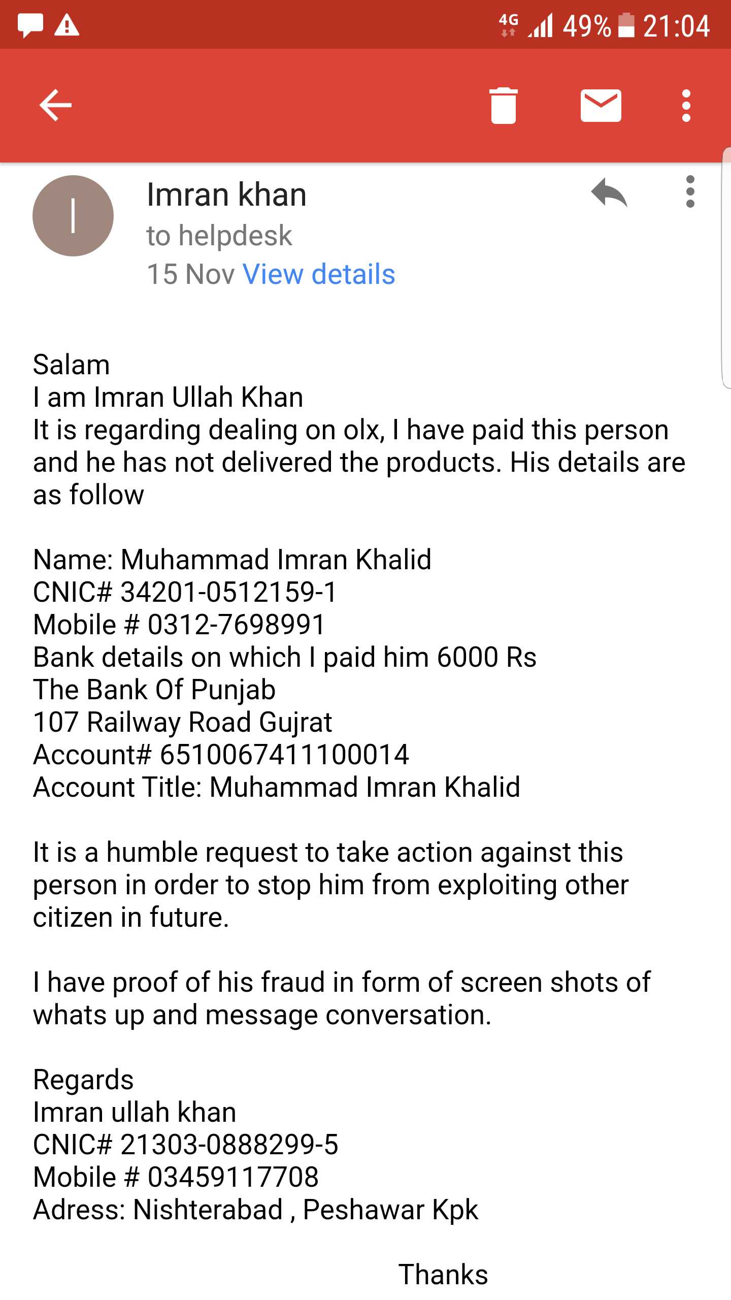 APP | Imran Khan | Salam This is about online fraud. I saw an ad/post on olx and paid for that product in advance but the seller had not delivered that product and start to ignore my call and messages. I reported this incident to the cyber crime via email but no responce yet. I have full proof and details of this incident and seller identy and his bank account on which I paid him. I can provide screen shots of the conversations . I will be waiting for your team advice what to do next. Thanks | 2019-12-13 20:52:48 |